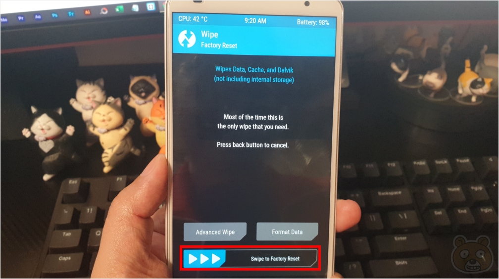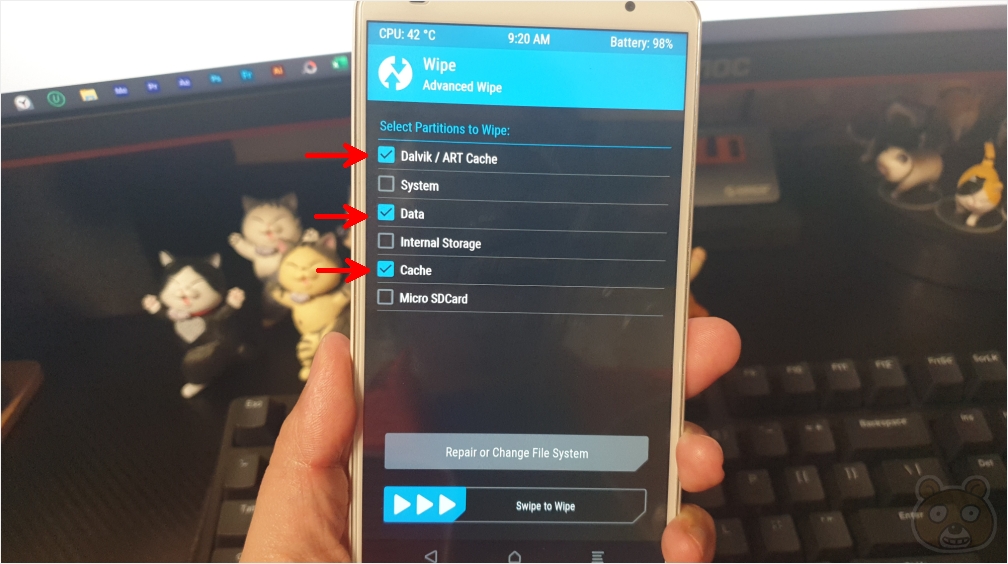 Dalvik/ART Cache, Data, Cache를 선택 후 스와이프 합니다.