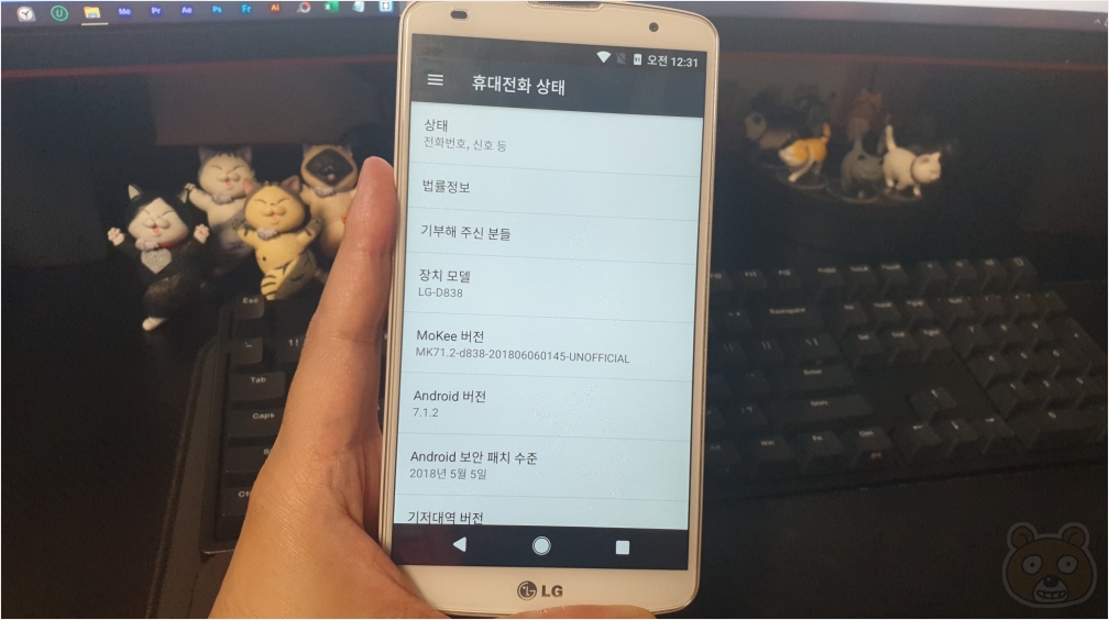 안드로이드 버전은 7.1.2 누가 버전입니다. 이 스마트폰은 와이파이 환경에서만 사용할 것이어서 유심을 연결해서 사용하지는 않고 있습니다. 근데 뭐 잘 되지 않을까 싶어요. 딱히 IEMI값을 수정한것도 아니니까요. 성공적으로 커스텀롬을 설치했습니다. 매우 기분이 좋습니다.