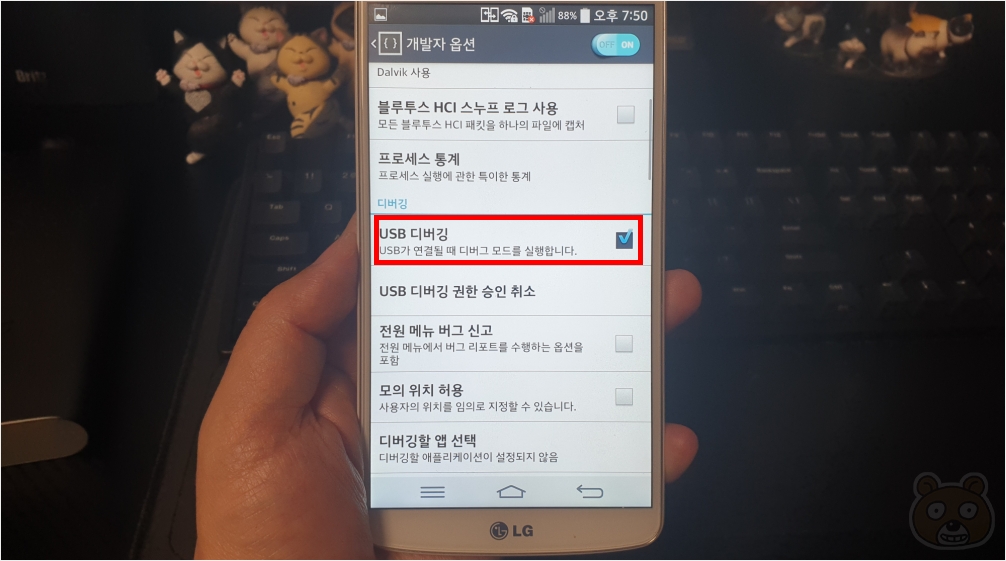 이제 USB 디버깅을 체크해줍니다. 혹시 해당 메뉴가 비활성화 상태라면 USB 케이블을 잠시 분리해주시면 됩니다. 개발자옵션에 들어가는 방법은 설정 > 소프트웨어 정보 > 빌드 번호를 연타하면 개발자 모드가 활성화 되었다는 안내창이 뜰 것입니다. 뒤로 가기를 해서 개발자 옵션으로 들어가 설정하시면 됩니다.