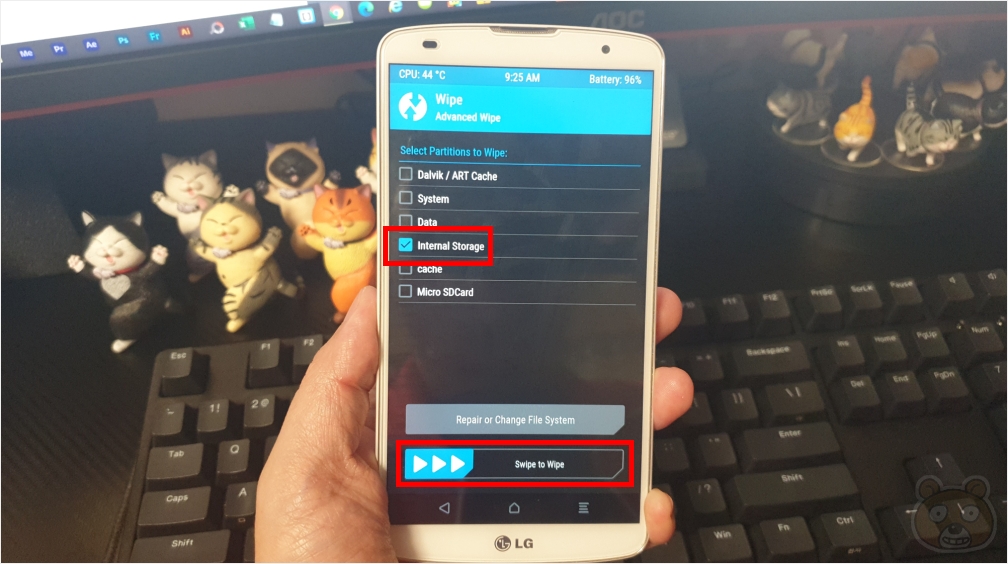 모두 다 설치가 완료되면 다시 처음의 8가지 메뉴가 있는 화면으로 돌아옵니다. 홈버튼을 누르면 됩니다. 이번에는 Wipe를 터치하고 트림 작업을 진행합니다. 아까는 3개를 선택했었죠? 이번에는 Internal Storage를 선택 후 스와이프를 합니다.