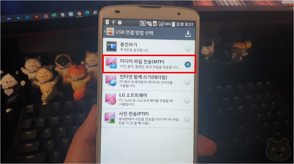 PC와 지프로2를 연결하면 USB 연결 방법 선택창이 뜹니다. 미디어 파일 전송(MTP)를 선택해줍니다.