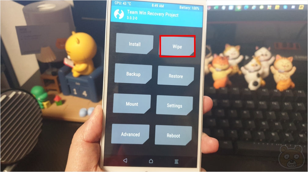 이제 8가지 메뉴를 볼 수 있습니다. Wipe를 터치합니다. Wipe는 일종의 트림 작업입니다. 불필요한 파일들을 모두 삭제하는 기능을 갖고 있습니다. 스와이프하여 다음 과정으로 넘어갑니다.