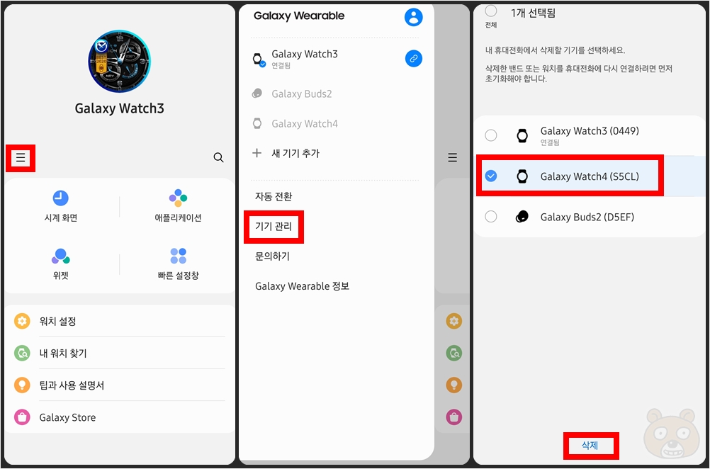 이제 스마트폰에서 등록되어있는 갤럭시워치4의 기기 목록을 삭제해야합니다. Galaxy Wearable 어플리케이션을 실행하여 왼쪽 메뉴버튼을 터치합니다. 그리고 기기 관리로 들어갑니다. 이 화면에서 갤럭시워치4를 선택 후 삭제 메뉴를 터치하여 기기 등록을 해제하면 끝입니다. 이렇게해야 이후에 중고로 되팔 수 있는 상태가 됩니다.