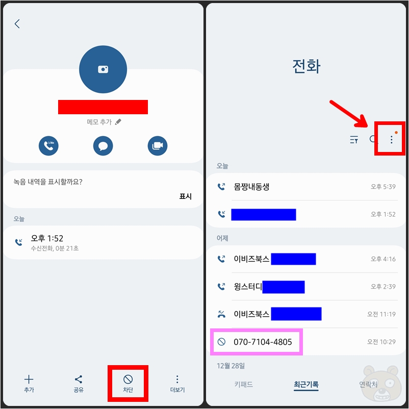 일단 차단하는 방법은 다들 알고 계실겁니다. 차단하고자 하는 번호를 터치해서 들어간 후 아래에 있는 차단 버튼을 터치하면되는 매우 간단하고 쉬운 과정입니다. 이제 차단한 번호를 통화 최근 기록에서 보이지 않게 만드는 방법입니다. 마침 적절한 예시가 보이는군요. 070으로 시작하는 스팸 번호가 제 스마트폰 최근 기록에 버젓이 보이고 있습니다. 분홍색으로 표시한 부분이죠. 오른쪽 상단에 있는 점 세개 아이콘 버튼을 터치합니다.