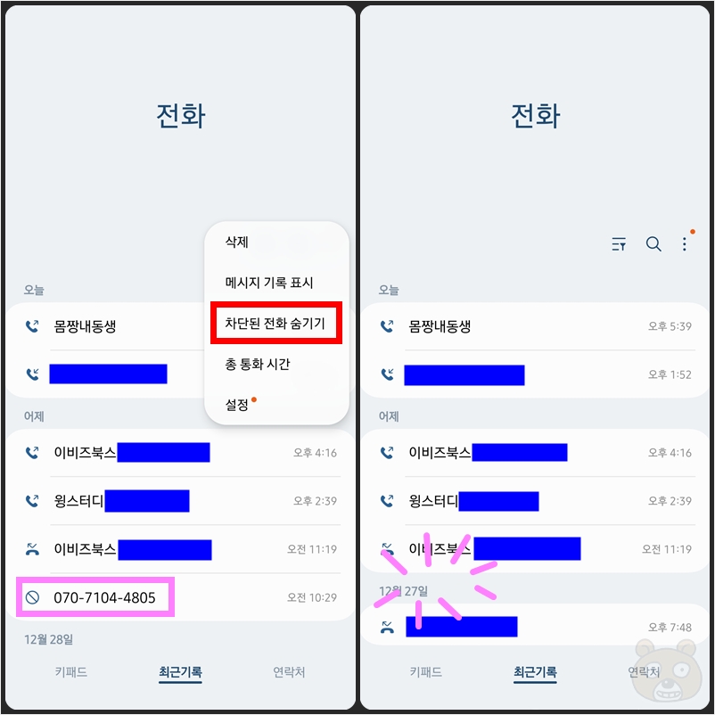 그럼 옵션이 다섯개가 나오는데 그중에서 차단된 전화 숨기기라는 옵션이 보일 것입니다. 터치해주시면 드디어 차단한 번호들이 최근 통화 기록에서 사라지게 됩니다. 엄청 간단하죠? 반대로 보이게 하려면 다시 메뉴 버튼을 눌러서 차단된 전화 보이기 항목을 터치하면 원래대로 돌아갑니다. 끝.