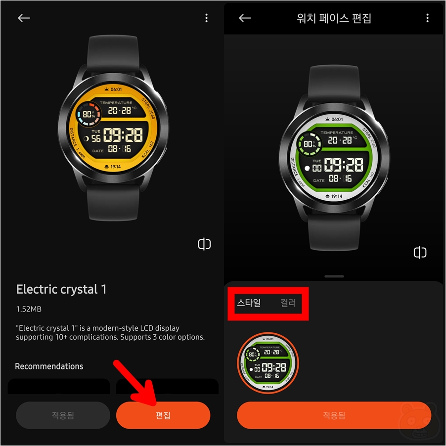 저는 카시오같은 전자시계 UI를 상당히 좋아합니다. 적당한걸 찾았습니다. 하지만 역시 갤럭시워치3의 그 UI는 아직까지 따라올수는 없네요. 편집 버튼을 누르면 추가 스타일 변화 또는 색상까지 변경이 가능한데 이것은 워치페이스마다 상이합니다.