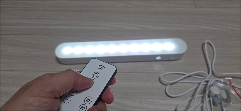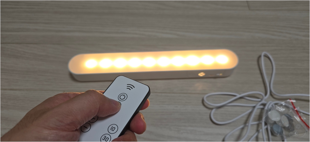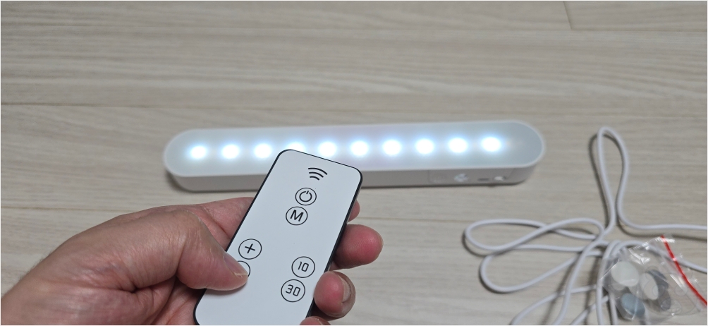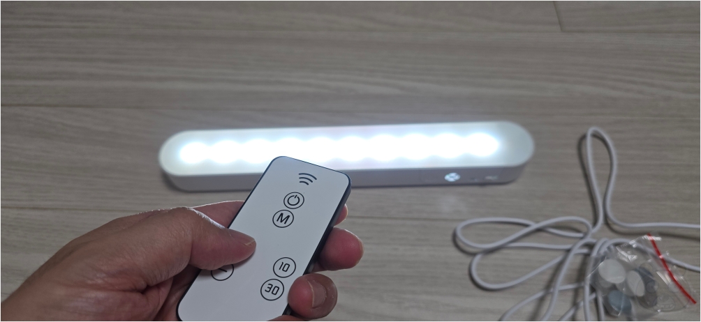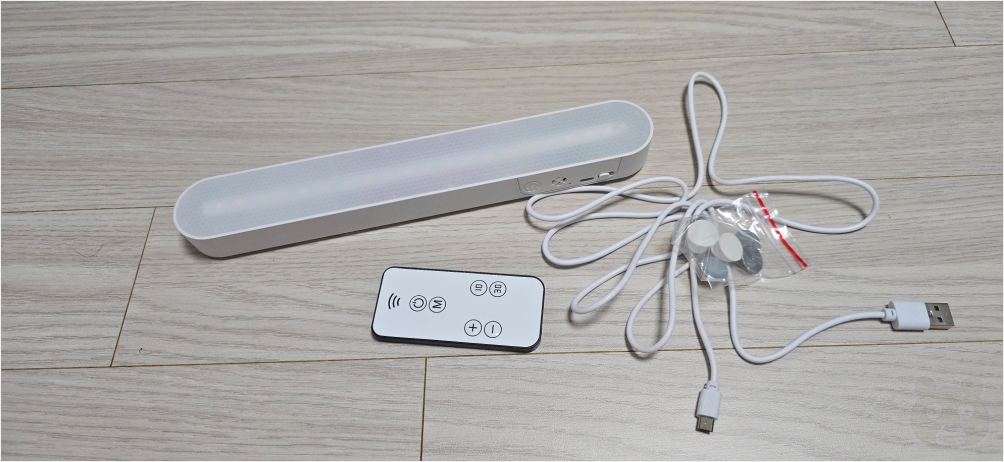 구성품입니다. 고정용 자석이 몇 개 들어있고 마이크로 5핀 충전 케이블, 그리고 리모컨, 마지막으로 LED 조명등입니다.
