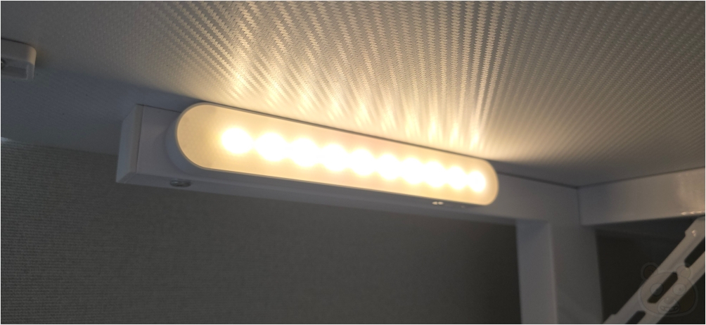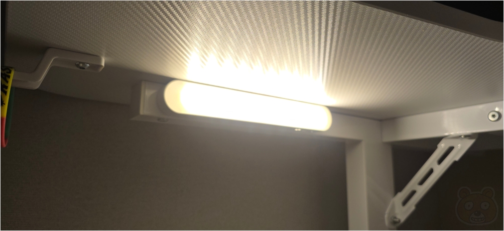 방 불을 끄고 블라인드로 최대한 빛을 가린 후 책상 아래의 철 프레임에 부착해 촬영해 보았습니다. 마그네틱이 들어있기에 쇠에 착! 하고 달라붙습니다.
