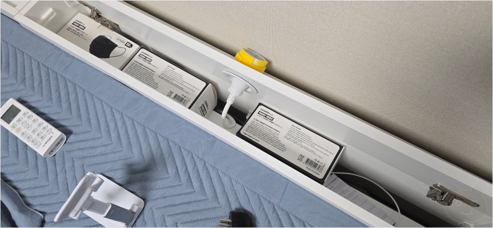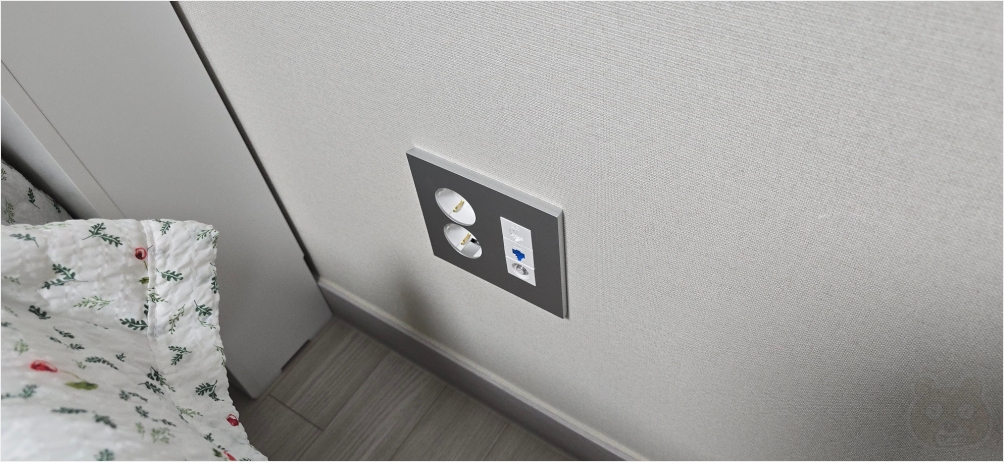 이렇게 침대가 붙는 벽쪽에 콘센트가 있어요. 근데 이걸 못 쓰게 되는거죠. 침대 때문에 말입니다. 이게 너무 아까웠기에 취침 편의성을 향상시키기 위하여 틈새장을 설치하는 것입니다.