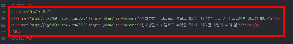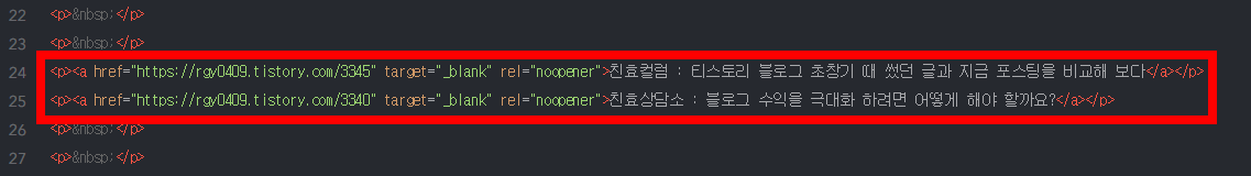 방금 이전 글 넣기 기능으로 넣은 글의 태그가 보입니다. 정확히 빨간색으로 표시한 부분의 태그들을 다음의 태그로 감싸주시면 됩니다.