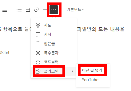 먼저 이전 글 넣기 기능으로 지금까지 썼던 글 중에서 본문과 관련 있는 글을 넣습니다.