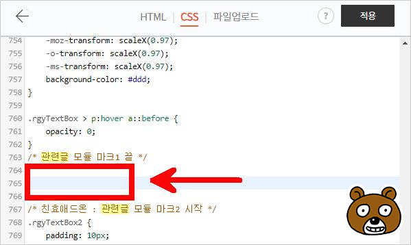 이렇게 빈 공간을 엔터로 확보하신다음 저곳에 붙여넣기 하시면 됩니다. 위의 스크린샷 이미지는 예시 입니다. 사용하시는 스킨에 따라 다를 수 있습니다. 중요한건 중괄호 {} 의 안쪽에 공간을 확보해서는 안 됩니다. 중괄호 밖에서 빈 공간을 만드셔야 합니다. 이렇게 하시면 CSS 세팅은 모두 끝납니다. 간단하지요?