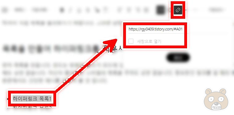 목록에 링크를 겁니다. 방금 만든 ID값을 똑같이 입력합니다. #을 빼먹지 않도록 합니다. HTML에서의 ID값은 페이지 기능을 가지고 있습니다. 그리고 하나의 페이지에는 하나의 ID값을 가집니다. 중복되어서는 안 된다는 이야기 입니다. 알파벳 대/소문자 구별을 하며 반드시 영어가 먼저 와야하고 이후에 숫자가 오면 됩니다. 숫자는 굳이 사용하지 않아도 되지만 영어 알파벳은 반드시 사용해야 합니다. 이 점만 기억하시면 됩니다. 구형 글쓰기 에디터에서는 풀주소를 입력하지 않고 #A01만 입력해도 넘어가지는데, 신형에서는 이게 안 됩니다. 저렇게 풀URL 주소를 넣어야 새창으로 열기도 해제가 되고 확인도 활성화가 됩니다. 상관 없습니다. 어차피 HTML 모드에서 한번 더 수정을 해줘야 하니까요.
