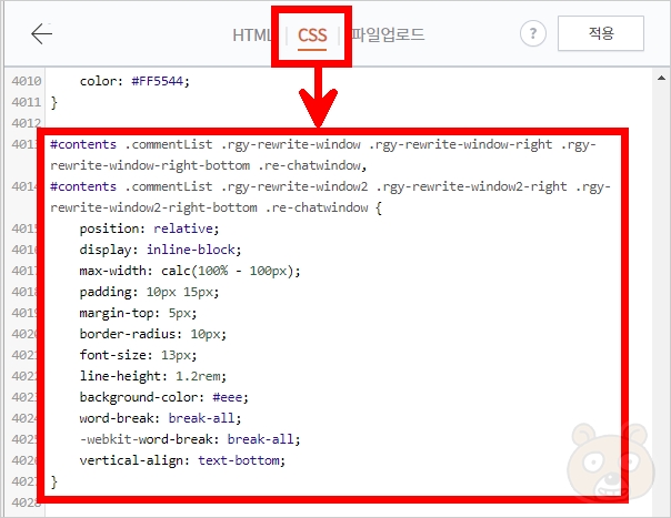 칮는 방법은 아무곳이나 클릭하여 커서를 활성화하고 Ctrl+F를 눌러 노란색 검색창을 띄웁니다. 그리고 .re-chatwindow 를 입력하여 찾으시면 쉽게 위치를 파악할 수 있습니다. 해당 항목에서 font-size: 13px; 이라고 되어있는 요소를 수정하면 댓글의 글씨에 대한 크기가 변경됩니다.