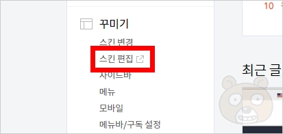 티스토리 관리자 페이지로 들어갑니다. 그리고 왼쪽 카테고리의 꾸미기 > 스킨 편집으로 들어갑니다.
