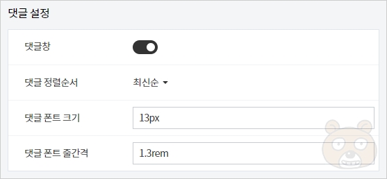 ●댓글 폰트 크기 : 댓글의 폰트 크기를 설정합니다. 13px 이 기본값입니다.