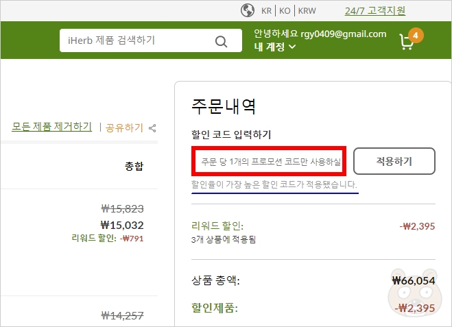 프로모션 할인 코드는 아이허브의 스페셜 코드라고 생각하시면 됩니다. 아이허브는 행사를 많이 합니다. 그럴 때마다 프로모션 할인 코드를 내놓습니다. 이 프로모션 할인 코드가 최소 두 개 이상인 기간도 있습니다. 이런 경우 프로모션 코드는 중복 할인은 되지 않습니다. 즉 프로모션 코드 중 가장 할인폭이 높은 코드를 사용하여 저렴하게 구매하면 됩니다.