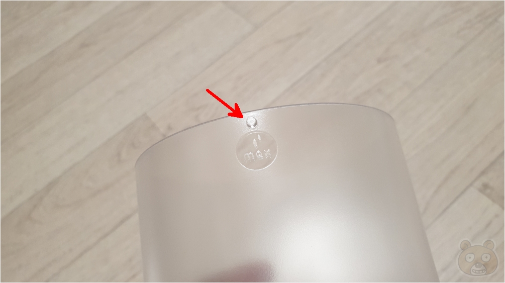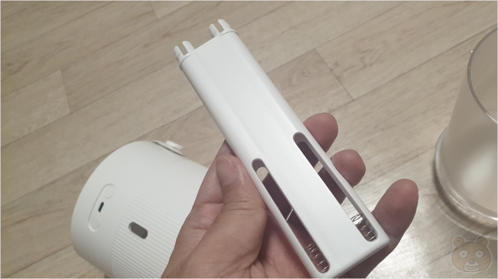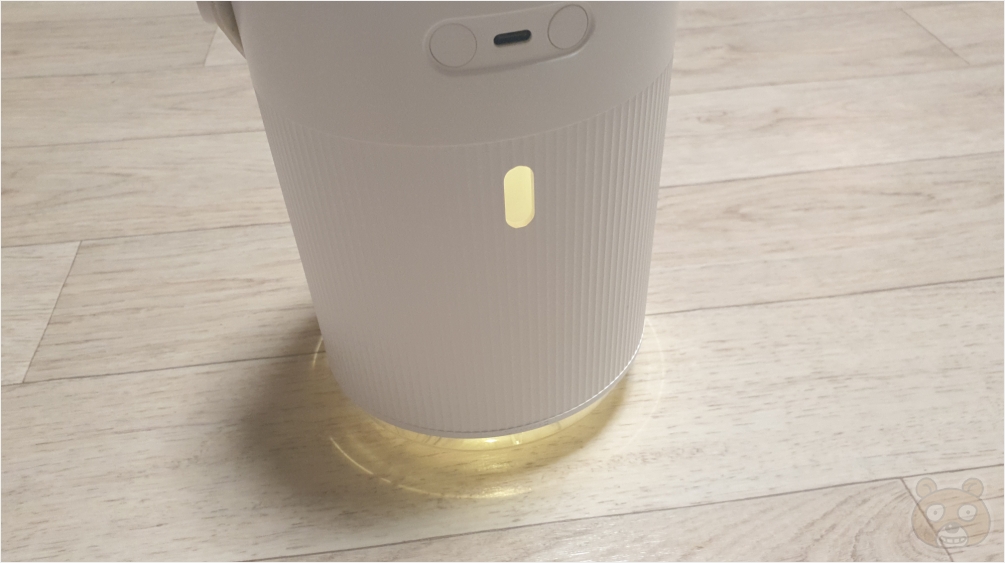 뒷부분에는 C타입 충전 단자와 왼쪽에는 무드등 버튼, 오른쪽에는 ON / OFF 및 동작 변경 버튼이 있습니다. 아래쪽 뚫려있는 것처럼 보이는 구멍은 급수량 상태를 확인하는 부분입니다. 위에서 물을 채워넣을 때 이 홀을 통해서 얼마나 물이 채워지는지 양을 확인할 수 있습니다.