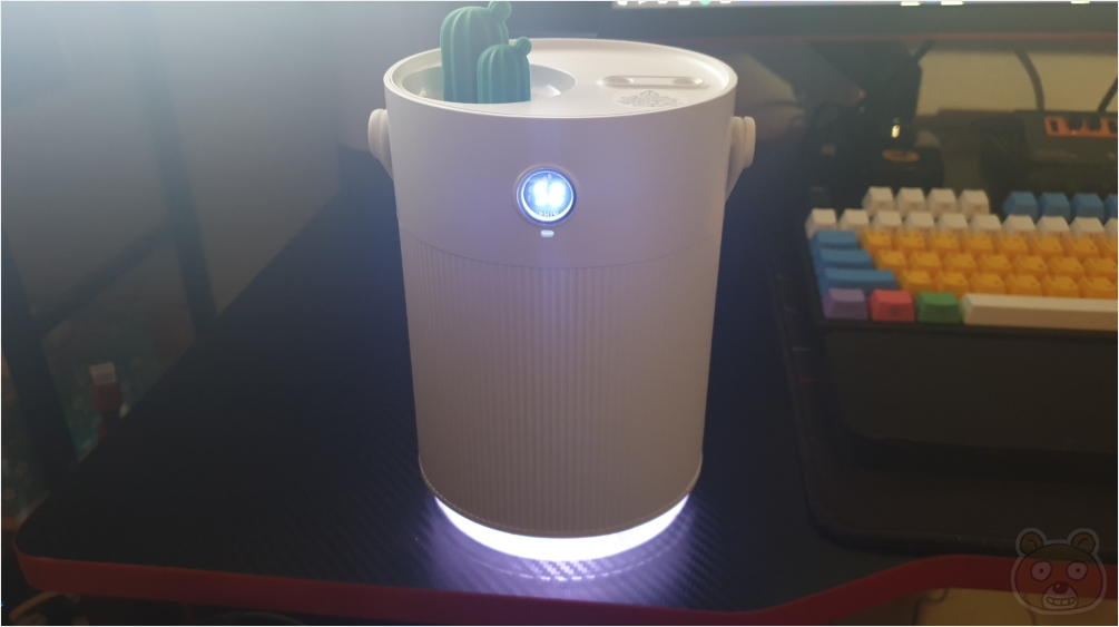 상단부의 모습입니다. 선인장 재질은 말캉하니 PU재질로 보여집니다. 탄성이 있습니다. 먼지가 쌓이면 청소하기가 조금 힘들 것 같군요. 그때 그때 훅 훅 불어줘야겠습니다. 선인장이 있는 움푹 들어간 곳이 급수부입니다. 이 제품은 수통(?)을 따로 분리하여 채울수도, 이렇게 상단부에 물을 부어 급수할수도 있습니다. 원하는 방식대로 급수가 가능합니다. 아무래도 빨리 물을 채워넣으려면 분리하는게 훨씬 빠를겁니다. 선인장 바로 옆에 구멍이 두 개가 있는데 여기에서 미세한 습기가 뿜뿜하고 뿜어져 나옵니다.