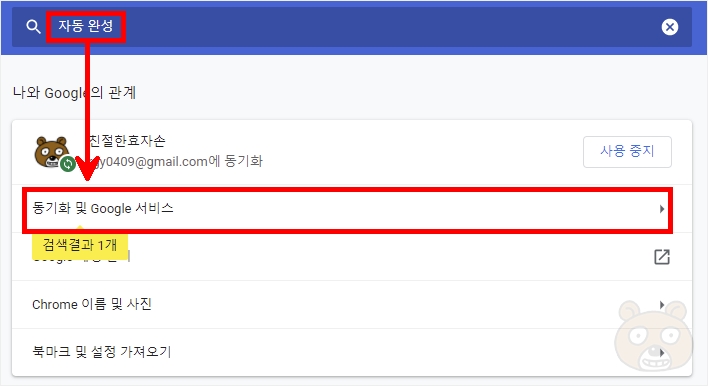 크롬 설정 탭이 열립니다. 검색창에 자동 완성이라고 입력하면 아래에 동기화 및 Google 서비스에서 검색 결과가 1개 있을겁니다. 해당 항목으로 들어갑니다.