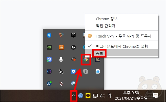 혹시 백그라운드가 실행되고 있을 수 있으니 이것도 완전히 종료합니다. 종료 방법은 작업표시줄의 숨겨진 아이콘으로 들어가 크롬 아이콘에서 마우스 오른쪽 버튼을 눌러 종료하시면 됩니다. 만약 크롬 아이콘이 보이지 않는다면 그냥 PC를 재시작 하시면 됩니다. 이렇게하면 크롬에서 자동으로 노란색 바로 복사 붙여넣기 되던 오류를 깔끔하게 수정할 수 있습니다. 드디어 크롬 브라우저에서 티스토리 글을 정상적으로 작성할 수 있게 되었습니다. 끝.