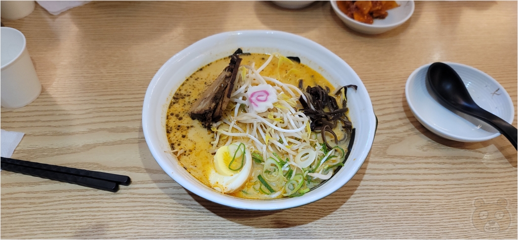 저녁 식사는 치킨과 라멘의 매치였습니다. 승자는 라멘이었구요. 치킨은 배달음식으로 흔하게 시켜먹을 수 있지만 라멘은 그렇지 않기에 오프라인 라멘 가게를 찾아서 식사했습니다. 원래 가려고 했던 라멘집이 또 사정상 문을 닫았기에 여기도 수소문끝에 검색 후 찾아간곳입니다. 신라면 정도의 맵기라고 했는데 맵찔이었던 제 기준에서는 상당히 매웠습니다. 신라멘 맵기의 3배 정도였던 것 같아요. 앞으로는 돈코츠만 먹을 예정입니다.