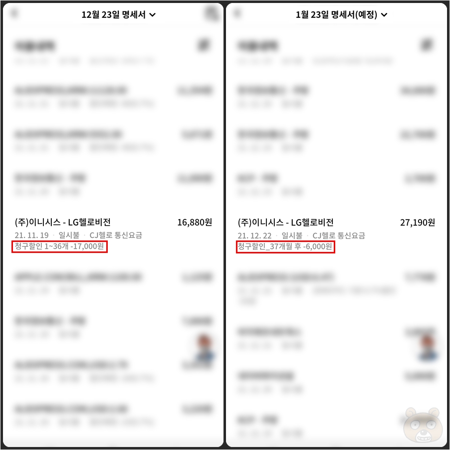보시면 36개월 까지는 월 30만원 사용 시 통신비 17,000원이 할인이 되었으나 이후인 37개월차부터는 6천원밖에 할인이 안 됩니다. 매달 16,000원 정도 나오던 휴대폰비가 27,000원 정도로 훌쩍 뛰니까 상당히 차이가 커 보입니다. 피부로 체감이 됩니다.