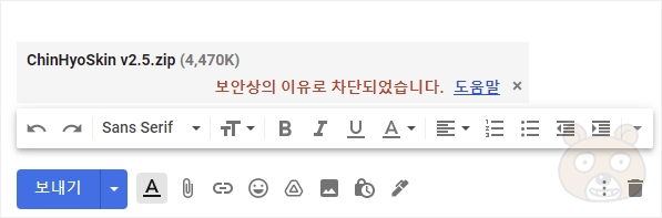 친효스킨을 후원제로 변경한 지금! 이제 파일을 일일히 후원자 분들에게 전송하고 있습니다. 근데 이게 압축파일 첨부가 되지 않습니다. 지메일만 그런게 아니고 네이버 메일도 그렇다군요. 물론 모든 메일 서비스가 동일하지는 않습니다. 다음의 경우에는 전송이 가능합니다. 허나 언젠가는 다음메일도 막힐게 뻔합니다. 이건 보안상 어쩔 수 없는 수순인 것 같습니다.