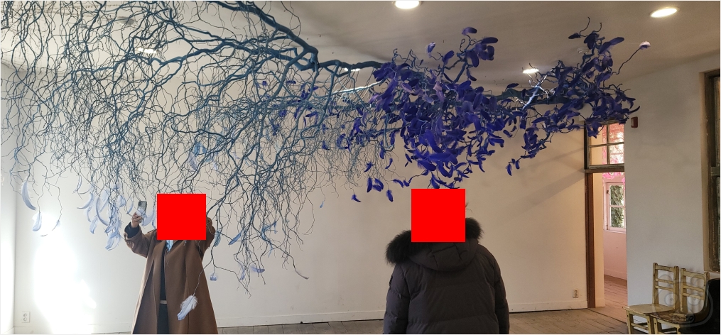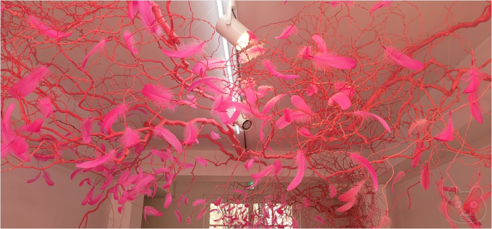 어쩔 수 없이 길냥이와 잠시 이별을하고 안으로 들어왔습니다. 핑크색 깃털이 매달려있는 나무가 이쁩니다.