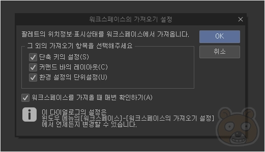 테스트1 워크스페이스를 누르면 이렇게 워크스페이스의 가져오기 설정창이 뜹니다. 팔레트의 위치 정보 및 표시 상태에 대하여 기본적인 가져오기가 실행되는군요. 그 외의 옵션으로는 단축키의 설정이나 커맨드 바의 레이아웃, 환경 설정의 단위설정도 그대로 가지고 올 수 있습니다. OK를 눌러보겠습니다.