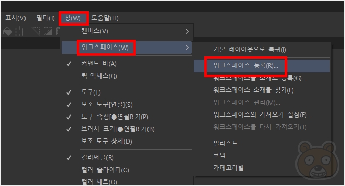 이제 지금의 이 클튜 환경을 저장해야 합니다. 창 > 워크스페이스 > 워크스페이스 등록으로 들어갑니다.