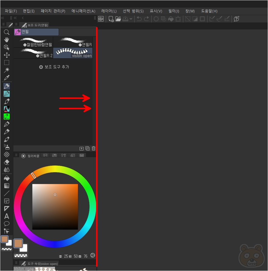 이렇게해서 처음 저장했던 테스트1 환경의 워크스페이스 로딩이 완료되었습니다. 패널 UI 크기는 테스트1때로 돌아간것을 확인했습니다. 그런데 분명 테스트2에서 새롭게 추가했던 브러시가 테스트1 환경에도 그대로 남아있습니다. 즉 클튜의 워크스페이스 환경 저장에 대해서는 다음과 같은 결론에 도달할 수 있습니다.