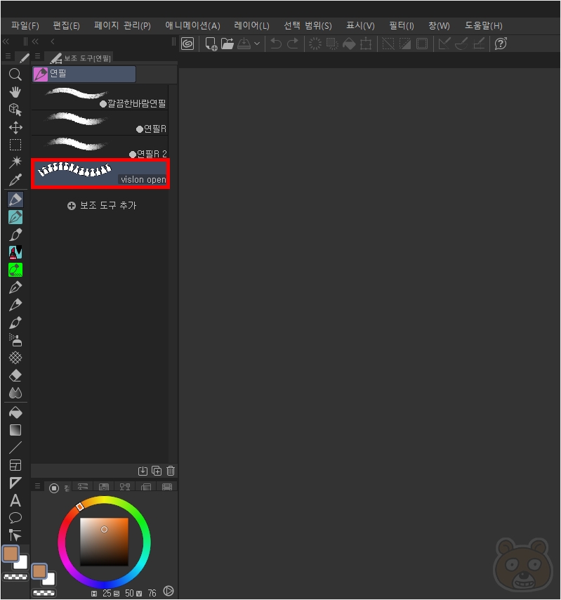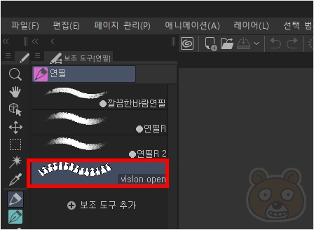 클립스튜디오를 실행 후 간단한 테스트를 위해서 브러시를 새롭게 추가해보았습니다. 사실 추가했다기 보다는 복사를 한 것입니다.