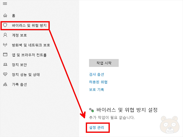 윈도우 디펜더창이 떴습니다. 바이러스 및 위협 방지를 눌러 설정 관리로 들어갑니다.