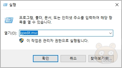윈도우키+R을 눌러 gpedit.msc를 입력 후 확인을 누릅니다.
