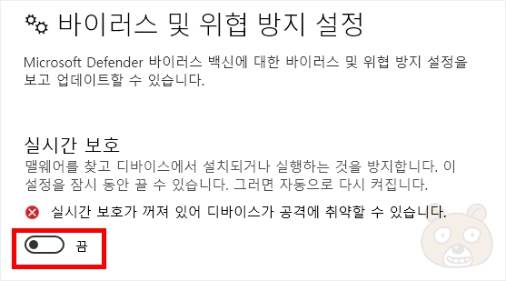 그러면 실시간 보호라는 항목을 만나게 될 것입니다. 현재 활성화 상태이므로 이 기능을 잠시 꺼둡니다. 그러면 윈도우 디펜더가 일시 정지 상태가 됩니다. 이제 백신때문에 막힌 프로그램을 실행 해주고 모든 작업이 끝났으면 다시 실시간 보호를 켜주시면 됩니다. 간단하죠?