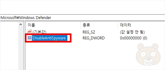 그러면 새 값 #1이라는 이름으로 새로 만들어질텐데 클릭 후 F2 혹은 마우스 우측 클릭 > 이름 바꾸기를 실행해서 DisableAntiSpyware로 변경해 줍니다. 그리고 더블클릭합니다.