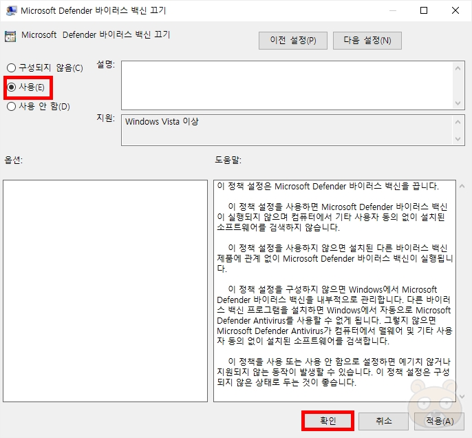 마이크로소프트 디펜더 바이러스 백신 끄기에 대한 로컬 그룹 정책 화면이 떴습니다. 기본값이 구성되어있지 않음에 맞춰져 있을텐데 이것을 사용으로 변경하고 확인을 눌러줍니다. 마소 디펜더 바이러스 백신 끄기에 대한 서비스를 사용함으로서 이 기능을 끄겠다는 의미입니다. 이제 컴퓨터를 재시작하면 윈도우 디펜더는 동작하지 않은 상태가 되어있을 것입니다. 다시 원래대로 돌려놓으려면 구성되지 않음으로 설정 후 확인을 눌러 재시작하면 됩니다. 끝.