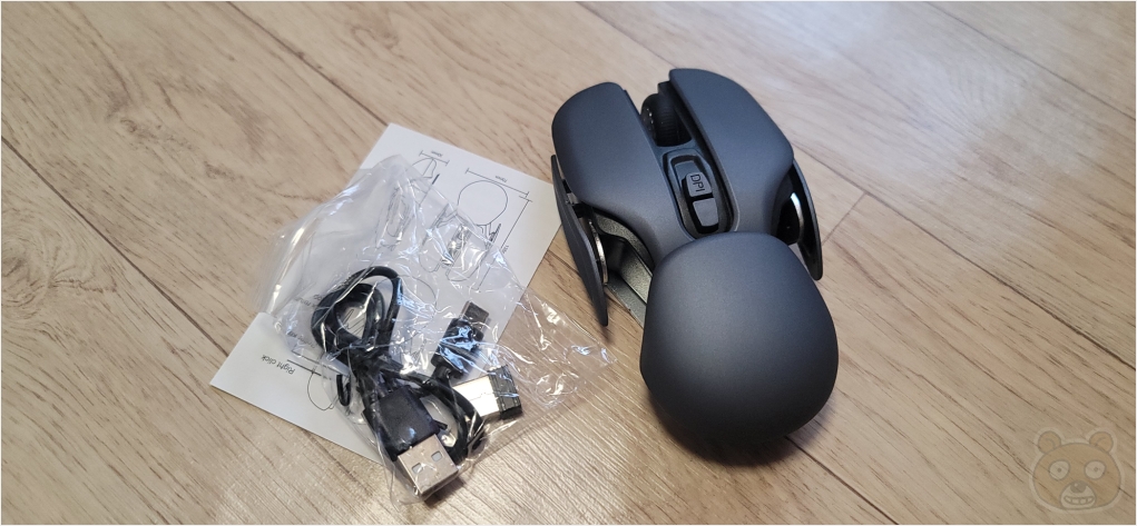 구성품입니다. 제품 설명서, C타입 충전 케이블, USB 무선 동글이, 그리고 본체인 무선 마우스입니다. 색상은 다크그레이, 블랙, 레드, 블루가 있는데 왠지 다크그레이가 땡겨서 구매해 보았는데... 다크 그레이라기 보다는 거의 블랙에 가까운 색상입니다.
