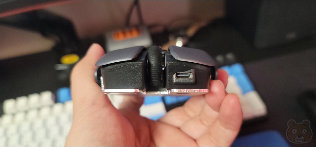 휠은 느낌이 좋습니다. 맨 앞에는 C타입 충전 단자가 위치해 있습니다. G304는 AA타입 배터리를 교체해야 하는데 이건 충전하는 방식이라 좋은 것 같습니다. 물론 수시로 충전을 해놔야 한다는 단점이 있습니다.