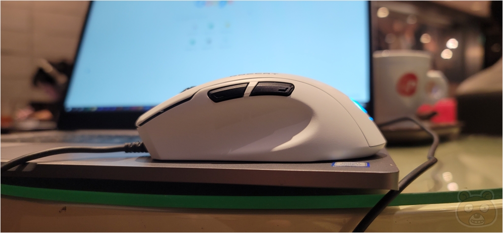 확실히 그립감이 좋네요. 왜 지인이 좋아했는지 알겠습니다. 저는 남자 손 치고는 상당히 작습니다. 이런 제 손에 쏘옥 들어오는 사이즈입니다. 너무 작지도, 크지도 않아서 좋습니다. 그야말로 마우스 위에 살포시 포개어 얹어 놓아도 안정적인 적절한 사이즈입니다. 클릭 감도도 좋습니다. 오른손의 엄지 손가락의 위치가 딱 저 위치에 안착될 수 있어서 편합니다. 또한 사람의 대부분은 검지보다는 빅엿 손가락인 중지가 조금 더 깁니다. 그렇기에 왼쪽 클릭 버튼 보다는 오른쪽 클릭 버튼이 좀 더 깁니다. 인체공학적인 디자인에 찬사를 보냅니다.