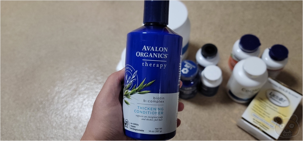이것이 오늘의 주인공인 아발론 오가닉 테라피! 비오틴 B-복합체 헤어 컨디셔너입니다. 구매 후기가 상당히 많아서 호기심에 구매해 보았습니다. 397g의 무게인데 g과 ml는 1:1이므로 약 400mL의 용량이라고 생각하시면 됩니다. 생각보다 엄청 크지는 않아요.