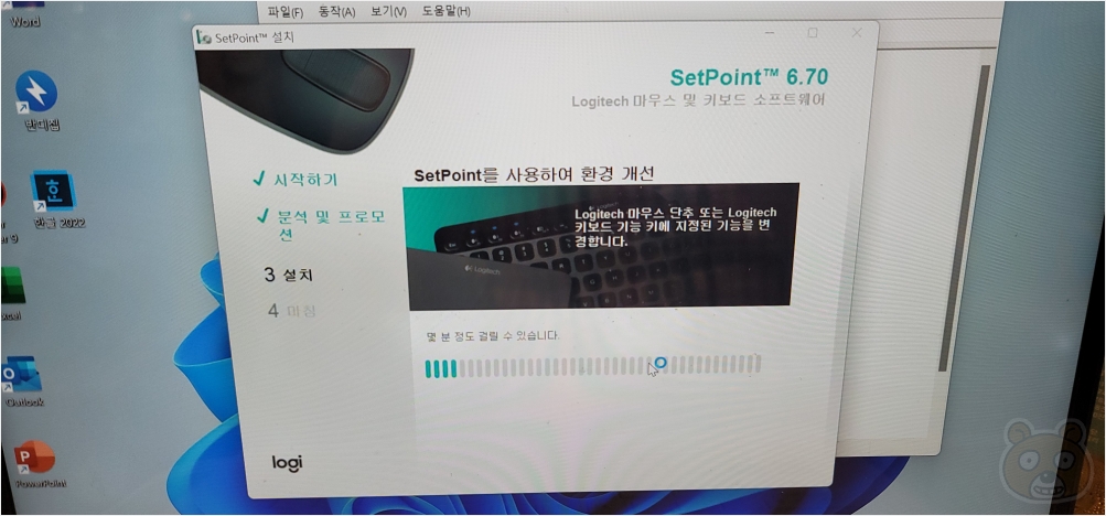 분석 및 프로모션 과정이 진행되는데 여기에서 시간이 꽤 소요됩니다. 사용중인 PC 사양과 환경에 따라 시간이 더욱 길어질 수 있습니다. 그리고 이 과정에서 문제의 기타장치인 Logitech Cordless Device 장치가 세팅될 것입니다.