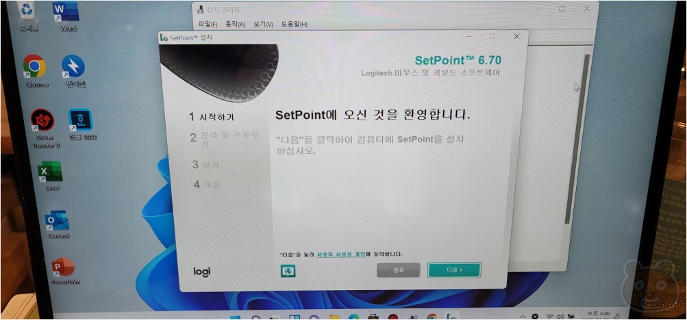 로지텍 세트포인트(SetPoint) 설치 과정입니다. 어려운 부분은 없습니다. 그냥 다음 다음 다음~ 이런 과정입니다. 오른쪽 하단에 있는 다음 버튼을 눌러서 설치를 시작합니다.