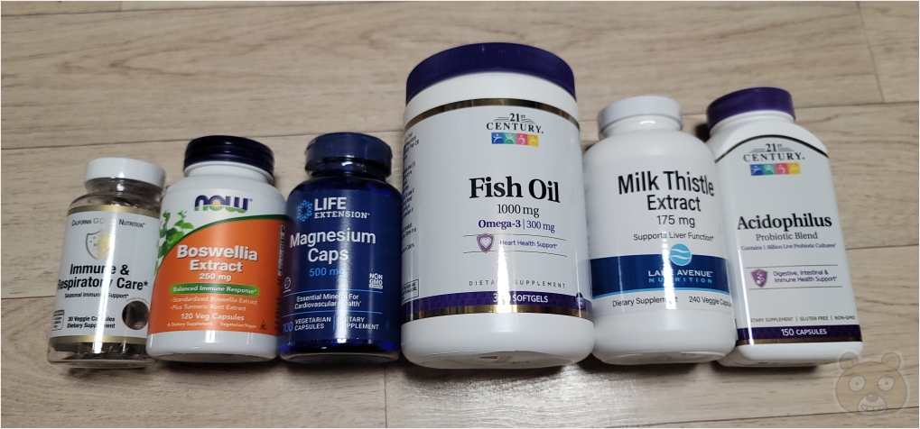 이번에 다 떨어져가는 제품들과 함께 같이 구매한 면역과 호흡기 케어에 도움이 된다는 CGN 제품이 맨 왼쪽에 보입니다. 나머지는 오른쪽 순으로 보스웰리아, 마그네슘, 오메가3, 밀크시슬, 프로바이오틱스입니다.