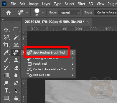 포토샵을 실행합니다. 왼쪽의 도구쿨에서 반창고 모양 아이콘을 선택합니다. 정식 명칭은 스폿힐링 브러시 툴(Spot Healing Brush Tool)입니다.