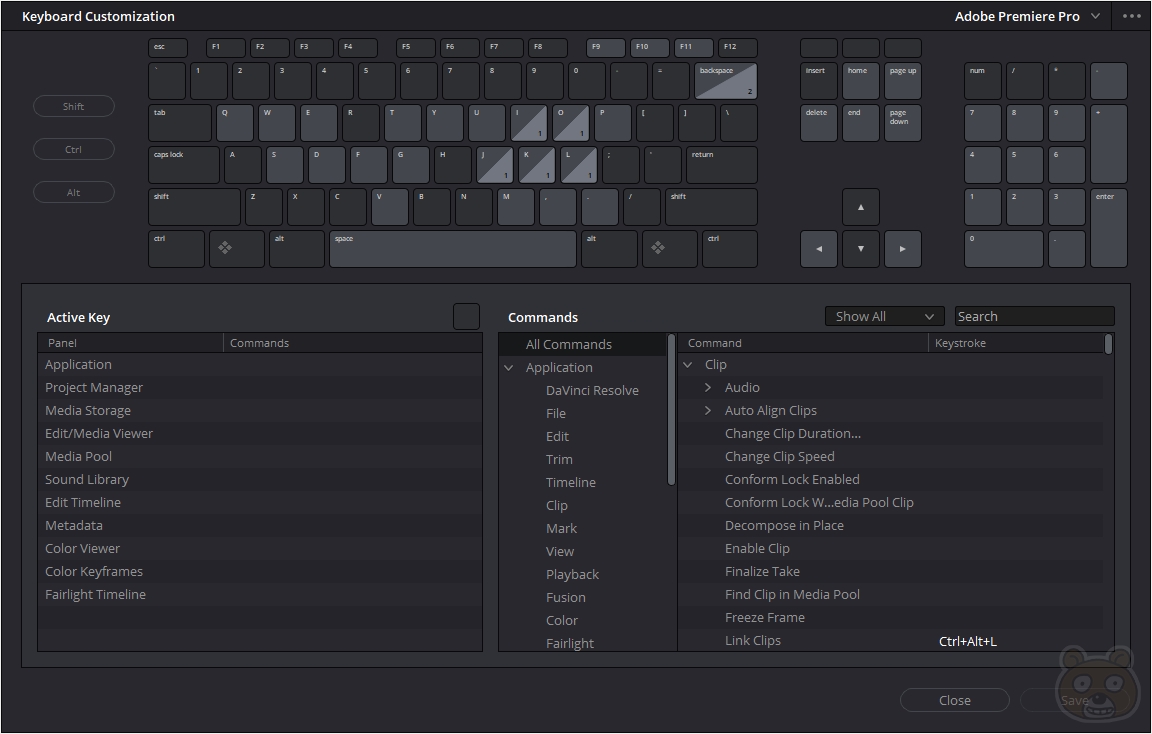 키보드 커스텀 화면이 떴습니다. 여기에서 단축키를 원하는대로 수동 변경하시면 됩니다. 하지만 오늘 내용은 프리미어 프로에서 사용중인 단축키를 다빈치 리졸브에서도 그대로 적용시키는게 목적이었죠? 정말 간단하게 이 부분을 적용시킬 수 있습니다. 오른쪽 상단을 살펴보시면 눈치가 빠르신 분들은 바로 알아차리셨을 겁니다.