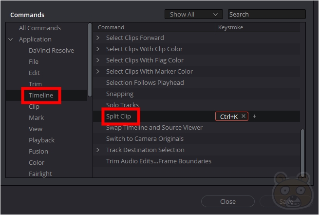 참고로 프리미어 프로에서 영상 자르는 단축키는 Ctrl+K 잖아요? 이것을 그대로 다빈치 리졸브에도 수동 적용시키는 방법은 위와 같습니다. TimeLine 항목에서 Split Clip을 찾습니다. 현재 단축키가 Ctrl+Shift+J로 되어있을텐데 이것을 수동으로 바꿔주시면 됩니다. 그러면 이후 다빈치 리졸브에서도 Ctrl+K를 사용해 영상 클립을 자를 수 있습니다. 끝.