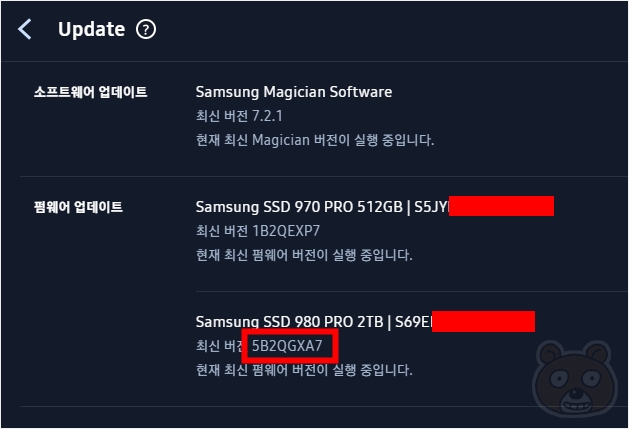 다행히 이 제품은 최신 버전의 980 Pro SSD였습니다. 펌웨어 버전이 5B2QGXA7 이라면 이 글을 작성하는 2023년 2월 12일을 기준으로 최신 버전입니다. 그리고 이슈가 있던 문제가 해결된 버전이기도 하므로 삼성 980 프로 SSD를 구매하시는 분들은 반드시 펌웨어 버전을 체크해 보시기 바랍니다. 만약 구버전의 SSD라면 펌웨어 업데이트 버튼이 보일 것이니 눌러서 버전 업그레이드를 진행하시면 됩니다.