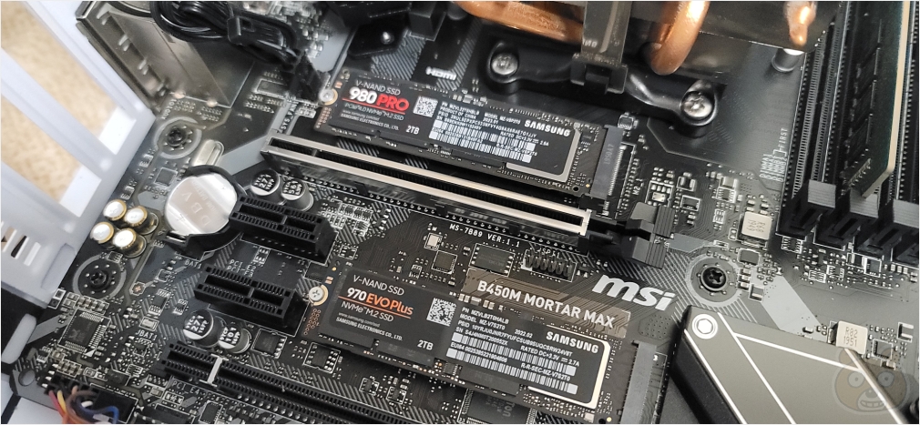 그래서 눈물을 머금고 메인보드에 직접 연결을 시도합니다. 메인보드는 MSI B450M 박격포 MAX 제품입니다. M.2 단자가 두 개 있습니다. 둘 다 사용중인데 펌웨어 인식 및 데이터 이사 작업을 위한 마이그레이션을 위해 어차피 잘 되지 않았나 싶었습니다. 따라서 장착중이던 970 EVO Plus는 잠시 빼두고 980 Pro를 장착합니다.